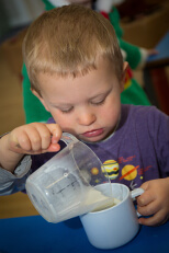 The children find their photograph and name and post it into the box to show we are ready to enjoy some snack. Then it's time to wash and dry our little hands before choosing between milk or water. We have some little jugs perfect for allowing the children to pour their own drink before tucking into some yummy toast.
